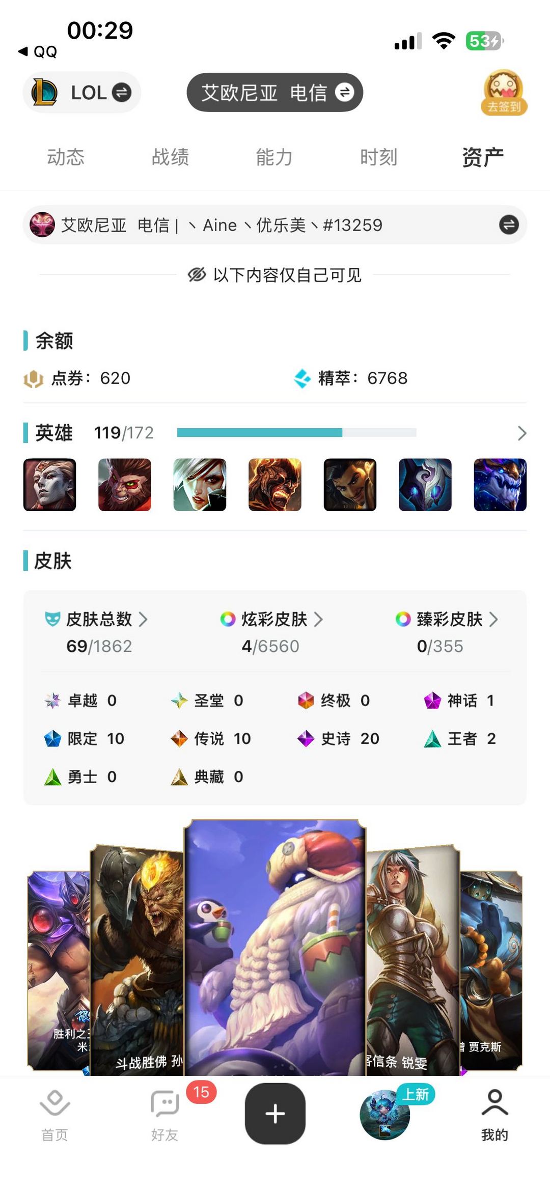 LOL账号119个英雄 69个皮肤 全天可玩 低价长租,免押金秒登