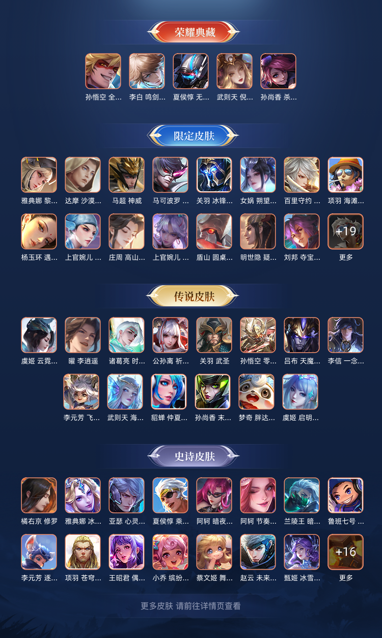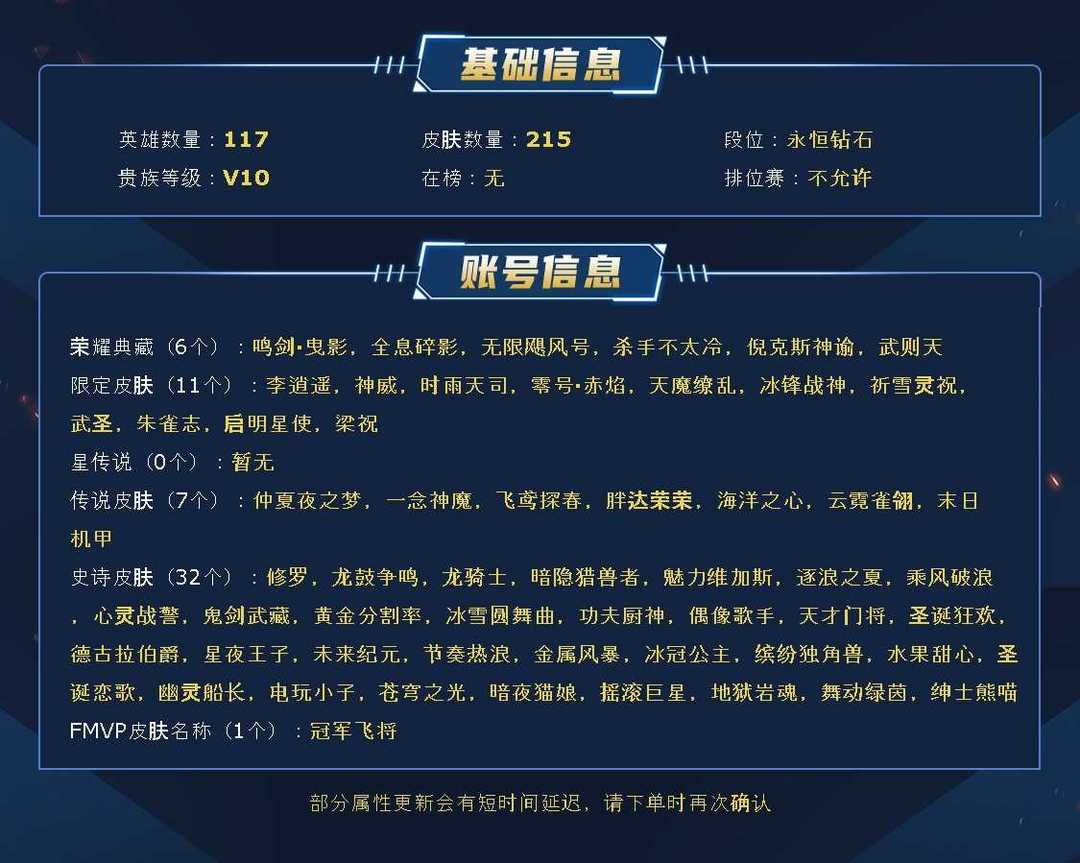 本游戏账号: V10用户,基础段位:永恒钻石II,英雄多,皮肤多。典藏皮肤5个,感受典藏皮肤带来的优质体验快感,FMVP皮肤1个,尽情享受FMVP皮肤带来的主角光环, 私人所属英雄皮肤有:李白 鸣剑·曳影||武则天 倪克斯神谕||孙悟空 全息碎影||孙尚香 杀手不太冷||夏侯惇 无限飓风号艾琳 觅芳踪||李元芳 飞鸢探春||诸葛亮 时雨天司||公孙离 祈雪灵祝||虞姬 启明星使||孙悟空 零号·赤焰||貂蝉 仲夏夜之梦||关羽 武圣||虞姬 云霓雀翎||李信 一念神魔||吕布 天魔缭乱||武则天 海洋之心||梦奇 胖达荣荣||孙尚香 末日机甲,等等