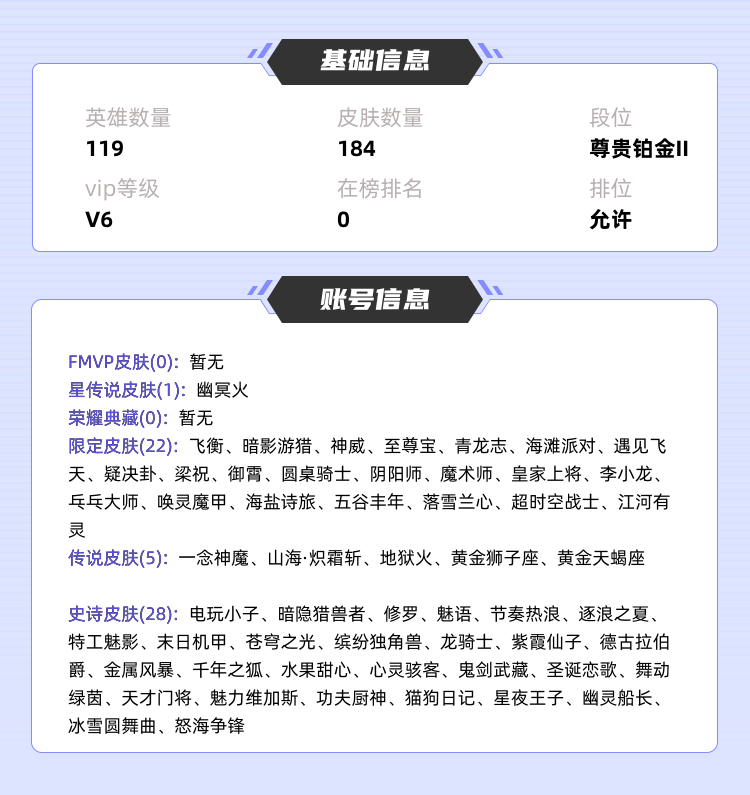 本游戏账号: V7用户,基础段位:星耀,英雄多,皮肤多。 私人所属英雄皮肤有:墨子 黄金天蝎座||李信 山海·炽霜斩||李信 一念神魔||孙悟空 地狱火||达摩 黄金狮子座刘禅 唤灵魔甲||阿古朵 江河有灵||桑启 海盐诗旅||钟无艳 超时空战士||甄姬 落雪兰心||鬼谷子 五谷丰年||马超 神威||鲁班大师 乓乓大师||铠 青龙志||裴擒虎 李小龙||马可波罗 暗影游猎||狄仁杰 魔术师||盾山 圆桌骑士||赵云 皇家上将||孙悟空 至尊宝||明世隐 疑决卦||韩信 飞衡||上官婉儿 梁祝||项羽 海滩派对||米莱狄 御霄||杨玉环 遇见飞天||狄仁杰 阴阳师,等等