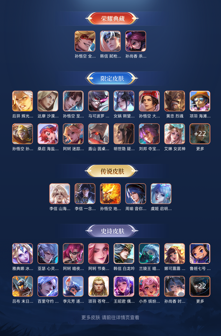 本游戏账号: ,英雄多,皮肤多。典藏皮肤3个,感受典藏皮肤带来的优质体验快感,FMVP皮肤3个,尽情享受FMVP皮肤带来的主角光环, 私人所属英雄皮肤有:孙尚香 杀手不太冷||孙悟空 全息碎影||韩信 弑枪猎影虞姬 启明星使||百里守约 碎云||周瑜 音你心动||李信 一念神魔||李信 山海·炽霜斩||孙尚香 乘龙·问璇玑||孙悟空 齐天大圣||孙悟空 地狱火||桑启 鸣野蒿||王昭君 乞巧织情,等等