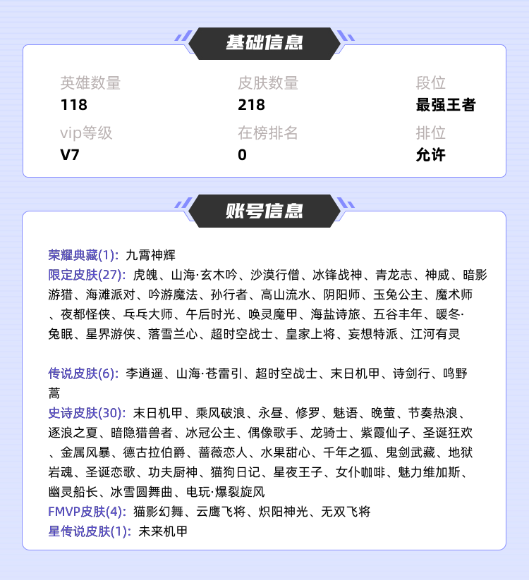 毁号,涉及毁坏虚拟财产罪及计算机安全罪,请文明游戏素质游戏,让我们共建美好租号平台 本游戏账号: 英雄多皮肤多。典藏皮肤1个感受典藏皮肤带来的优质体验快感FMVP皮肤4个尽情享受FMVP皮肤带来的主角光环 私人所属英雄皮肤有:花木兰 九霄神辉孙尚香 末日机甲李白 诗剑行狄仁杰 超时空战士曜 山海·苍雷引曜 李逍遥镜 炽阳神光貂蝉 猫影幻舞曜 云鹰飞将马超 无双飞将等等 注意事项: A.游戏过程中请不要恶意挂机或者不文明发言B.恶意挂机、顶号等行为将被拉黑无法再次下单C.进入游戏后中途请勿退出登陆,否则无法再次上号D.部分账号由于异地登录可能会出现密码错误提示,通常再尝试5-6次后可上号。 喜欢本账号请点 ☆收藏☆ 方便下次租用,谢谢光临惠顾