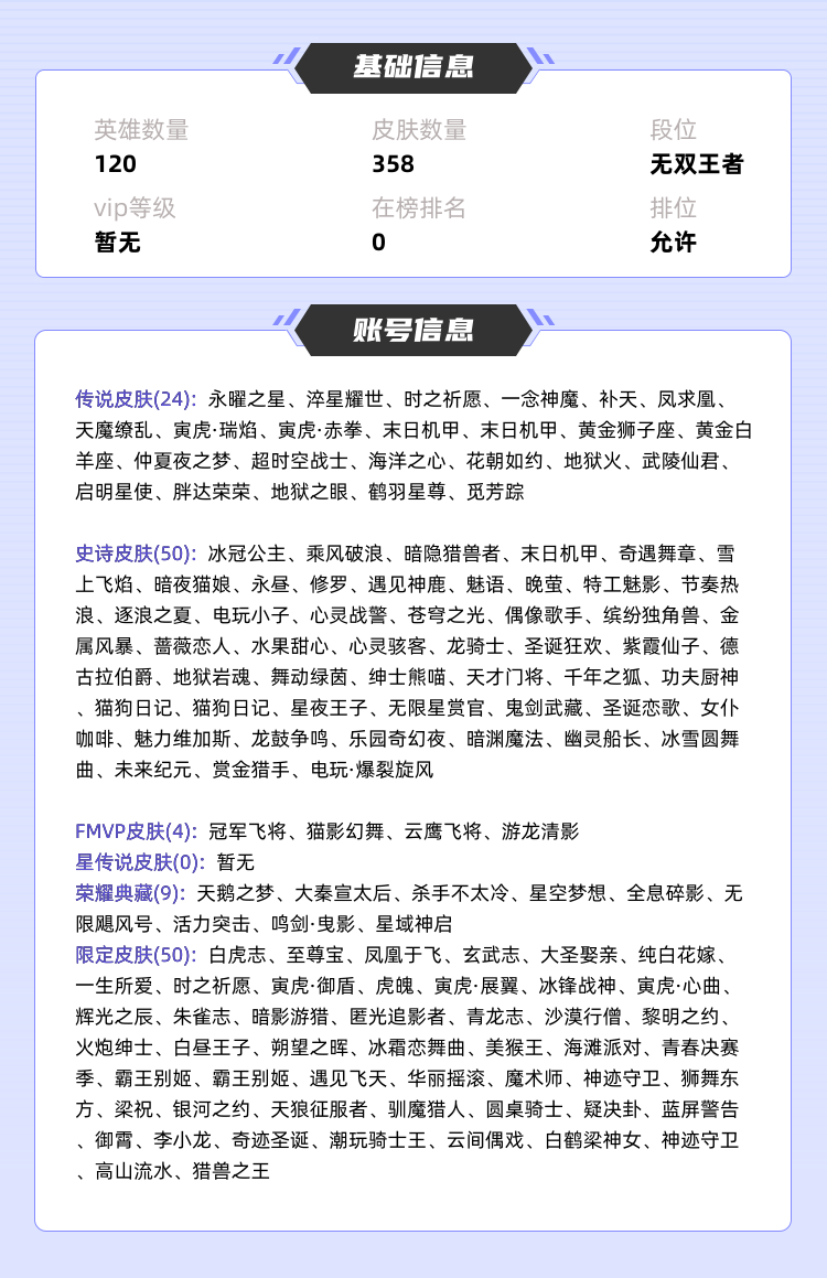 本游戏账号: ,基础段位:无双王者,英雄多,皮肤多。典藏皮肤9个,感受典藏皮肤带来的优质体验快感,FMVP皮肤4个,尽情享受FMVP皮肤带来的主角光环, 私人所属英雄皮肤有:小乔 天鹅之梦||孙悟空 全息碎影||孙尚香 杀手不太冷||诸葛亮 星域神启||芈月 大秦宣太后||李白 鸣剑·曳影||程咬金 活力突击||鲁班七号 星空梦想||夏侯惇 无限飓风号,等等