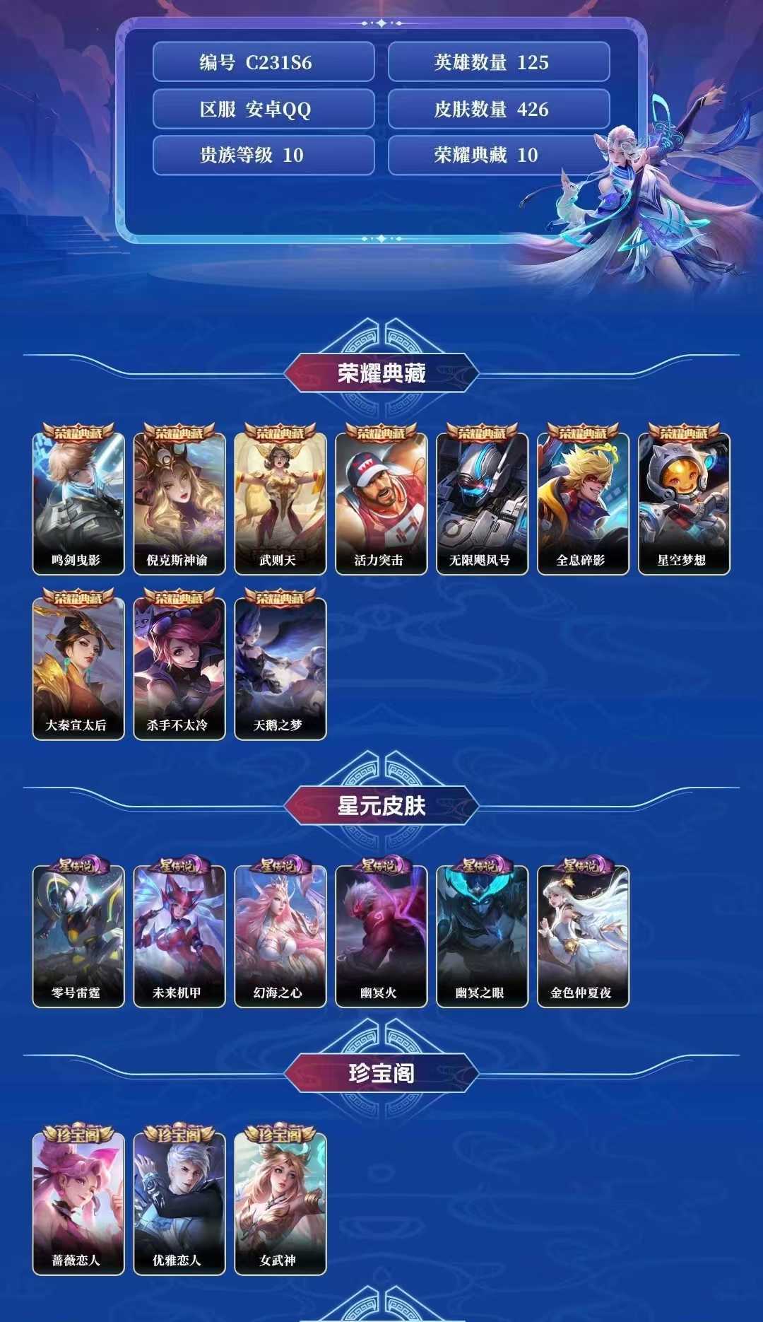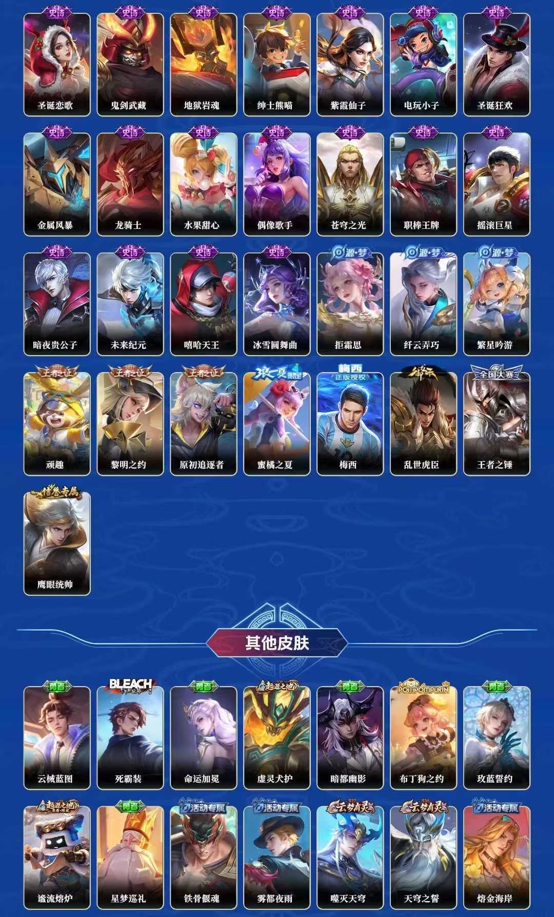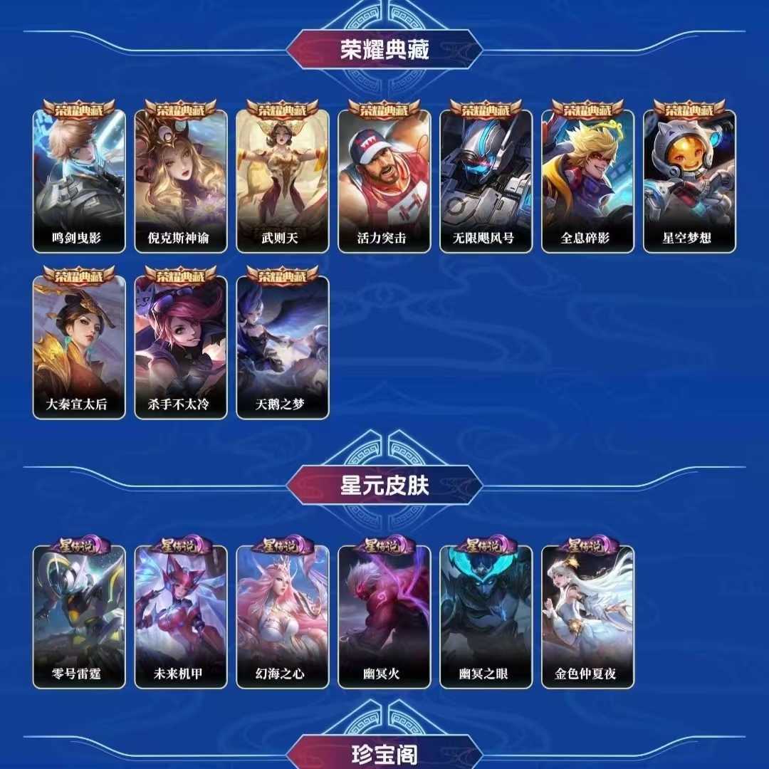 【C270】贵族V10~426皮肤10水晶40传说祈雪灵祝时雨天司倪克斯神谕,全息碎影,鸣剑曳影,活力突击,遇见胡旋,李逍遥,太华,太华,天魔缭乱,无限飓风号,大秦宣太后,星空梦想,天鹅之梦,杀手不太冷【全山海情兔年,全寅虎,全五虎上将,全牛年,全五兽】