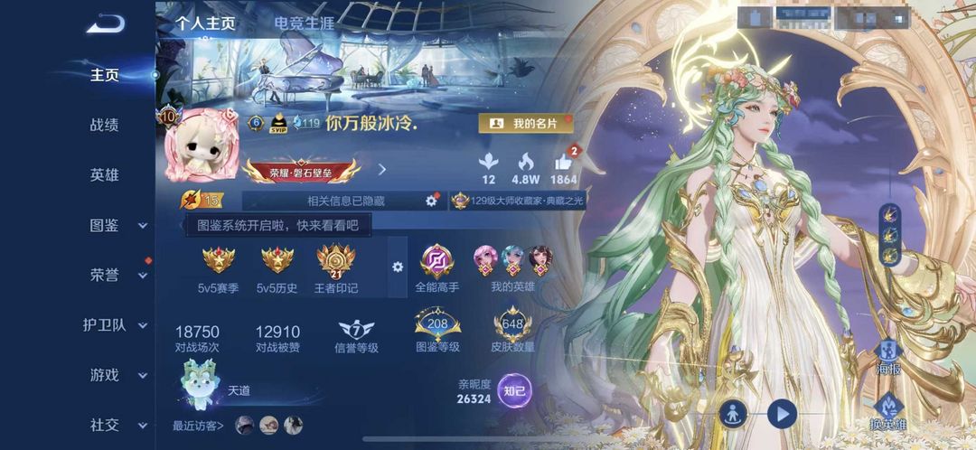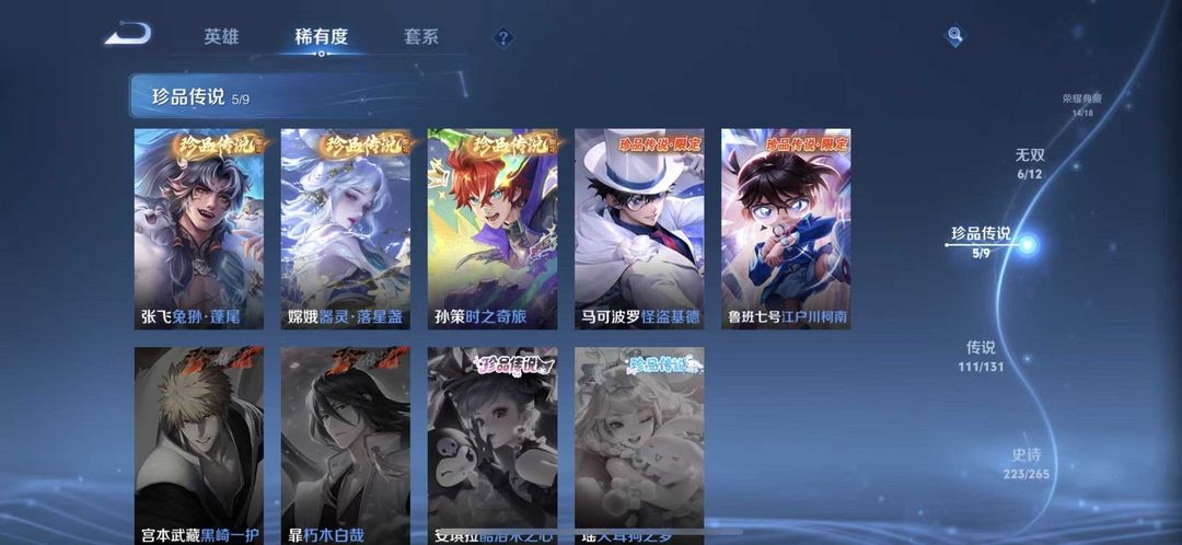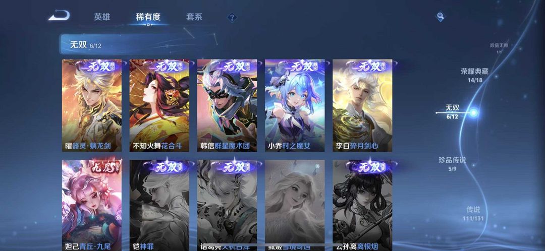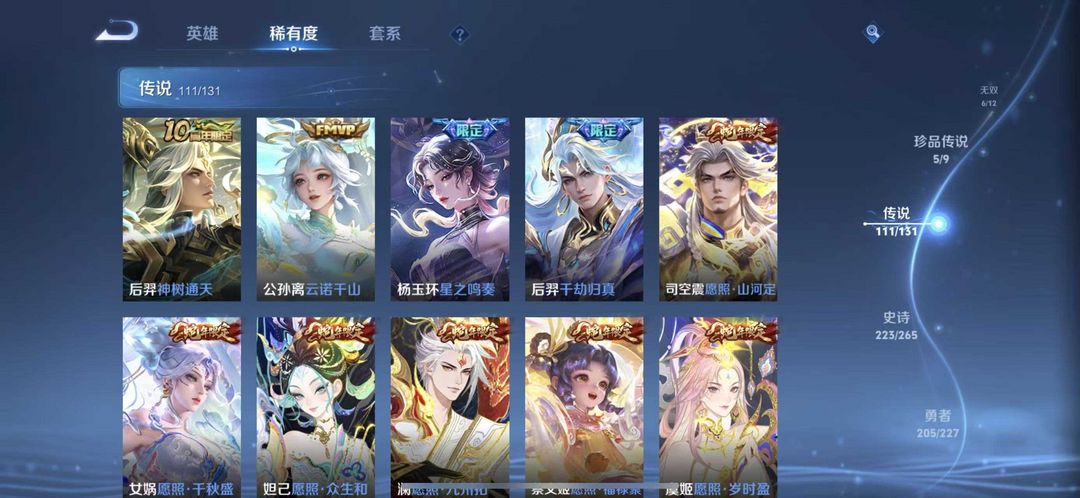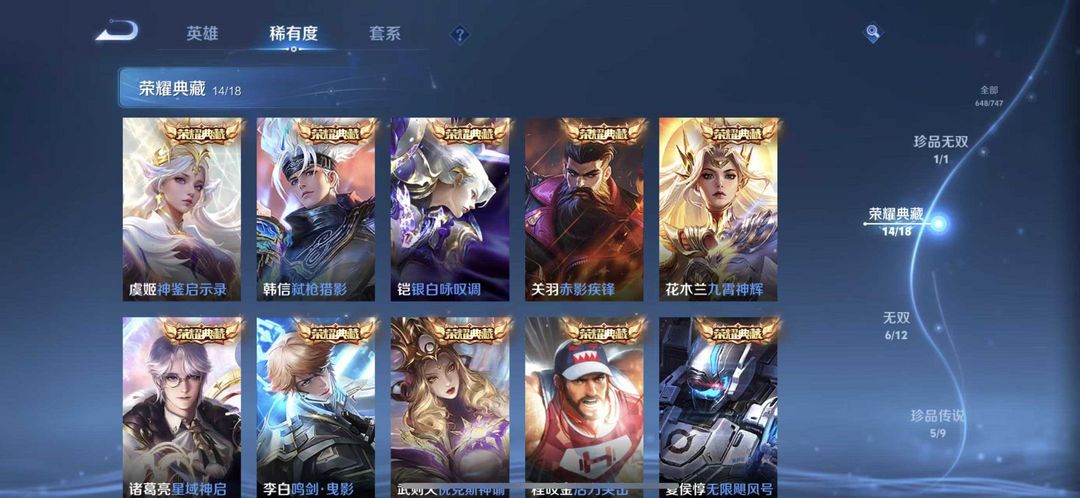 本游戏账号: V10无双贵族用户,基础段位:至尊星耀IV,英雄多,皮肤多。典藏皮肤18个,感受典藏皮肤带来的优质体验快感,FMVP皮肤10个,尽情享受FMVP皮肤带来的主角光环, 私人所属英雄皮肤有:瑶 拾光映像||小乔 天鹅之梦||武则天 倪克斯神谕||韩信 弑枪猎影||虞姬 神鉴启示录||诸葛亮 星域神启||孙悟空 全息碎影||伽罗 最初的交响||孙尚香 杀手不太冷||李白 鸣剑·曳影||貂蝉 幻阙歌||夏侯惇 无限飓风号||铠 银白咏叹调||鲁班七号 星空梦想||花木兰 九霄神辉||芈月 大秦宣太后||关羽 赤影疾锋||程咬金 活力突击,等等
