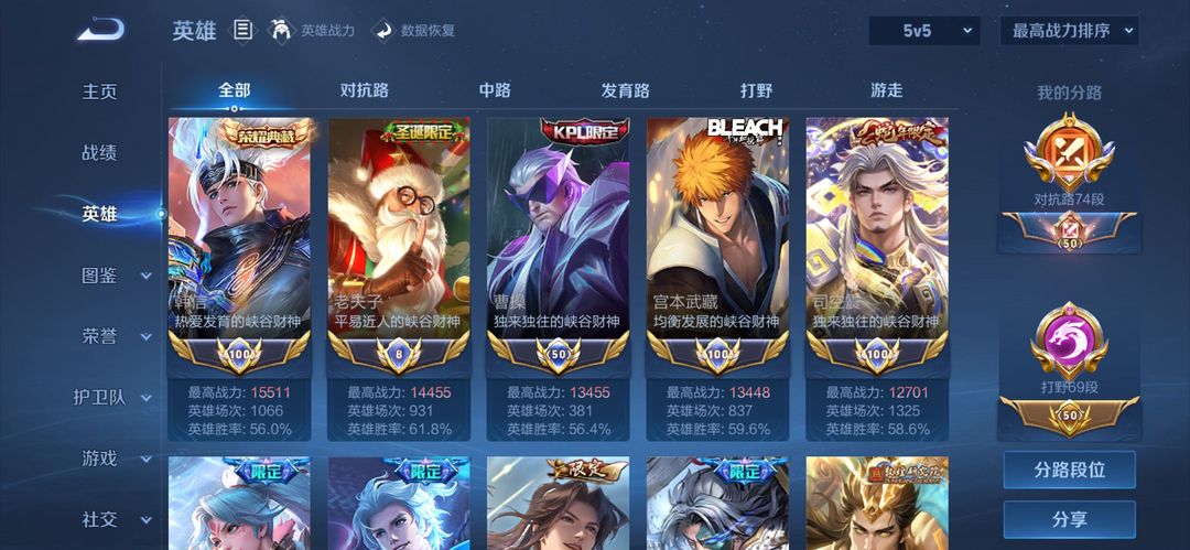 V10六国服宫本韩信司空震⚡️在榜省标对抗高分路打野⭐️天机白泽黑崎一护天幕⭐️全皮韩信马超澜宫本