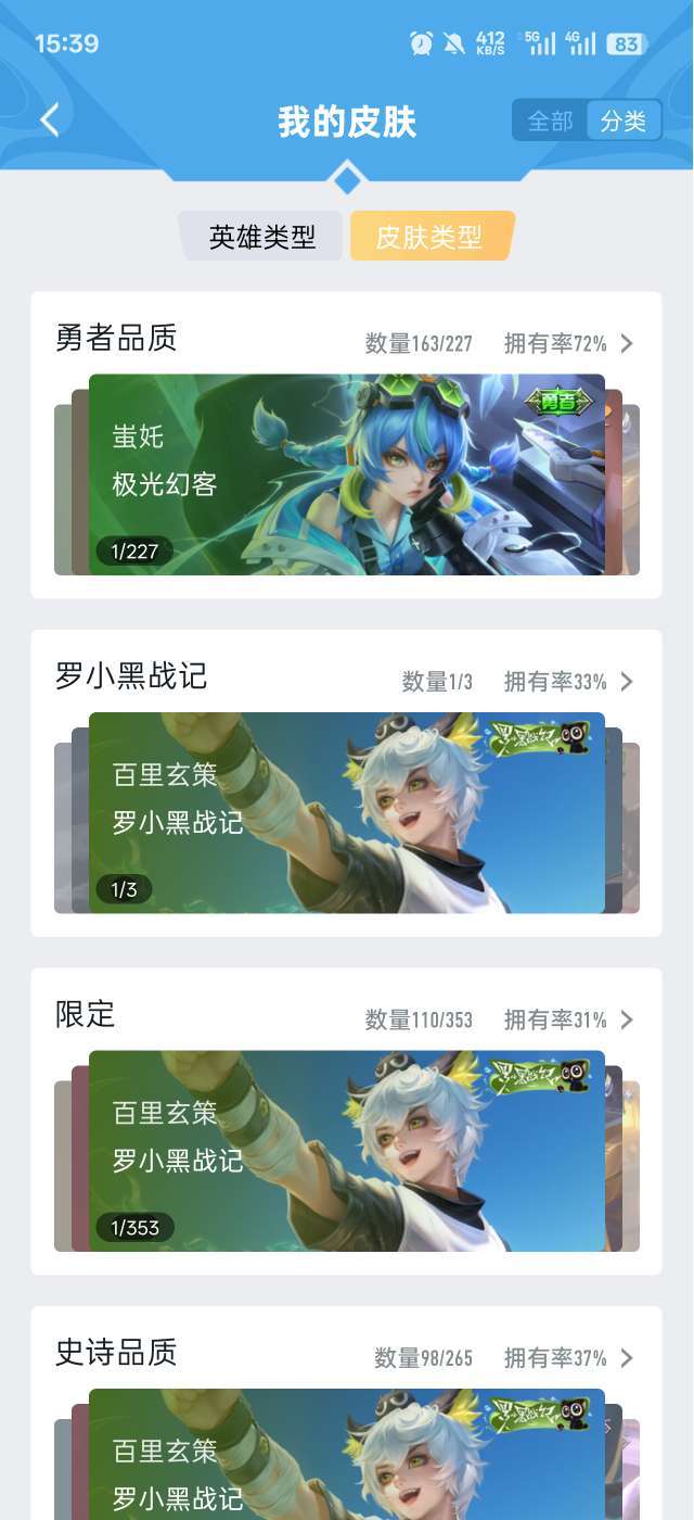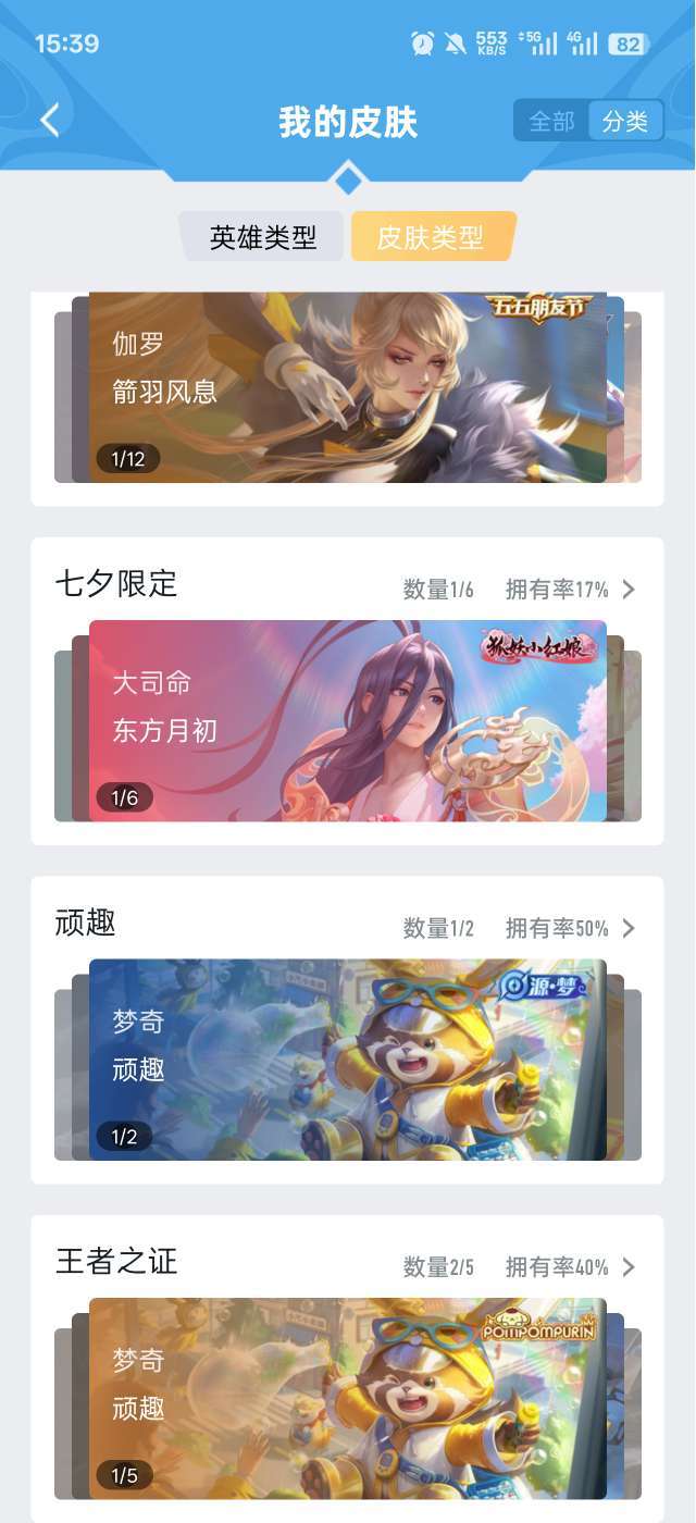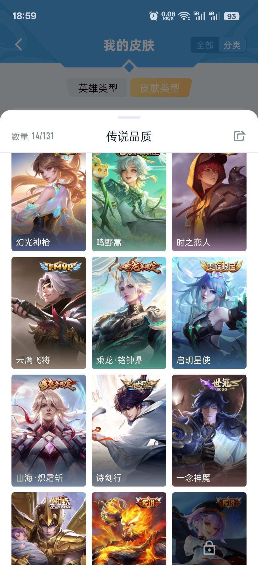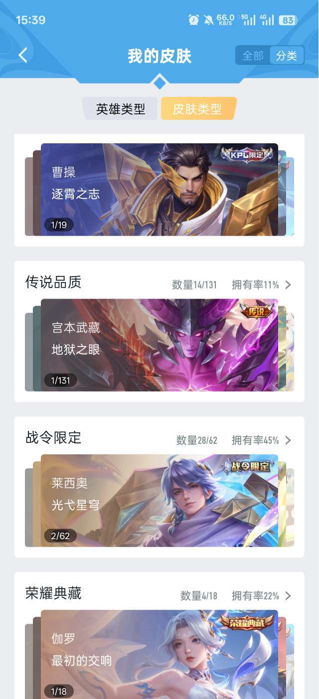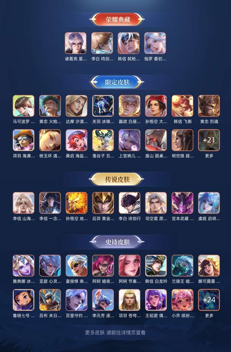 354款皮肤4款荣耀典藏韩信伽罗诸葛亮李白14款传说,108款限定,95史诗,大圣娶亲猴子。