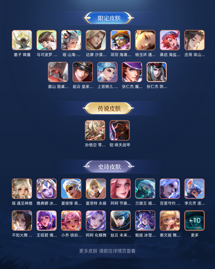 【史诗皮肤48】 王昭君偶像歌手 阿轲化蝶舞 曹操幽灵船长 李白千年之狐 露娜紫霞仙子 百里守约百相守梦 夏侯惇乘风破浪 瑶遇见神鹿 百里守约特工魅影 亚连破空之剑 小乔缤纷独角兽 杨玉环遇见飞天 李白谪仙醉月 狄仁杰魔术师 夏洛特永昼 阿轲节奏热浪 宫本武藏鬼剑武藏 程咬金功夫厨神 鲁班七号蔬乡物语 赵云皇家上将 兰陵王暗隐猎兽者 妲己女仆咖啡 高渐离燃音魔法 伽罗琥珀纪元 蔡文姬舞动绿茵 云中君纤云弄巧 蒙恬荣光圣徽 司空震地狱燃心 李元芳逐浪之夏 安琪拉心灵骇客 阿古朵江河有灵 百里守约真我赫兹 甄姬冰雪圆舞曲 诸葛亮黄金分割率 百里玄策热力回旋 李元芳匿光侦查者 花木兰水晶猎龙者 雅典娜冰冠公主 刘禅电玩爆裂旋风 孙尚香水果甜心 瑶山海碧波行 马可波罗山海玄木吟 孙策猫狗日记 狄仁杰鹰眼统帅 墨子金属风暴 庄周高山流水 上官婉儿梁祝 妲己魅力维加斯