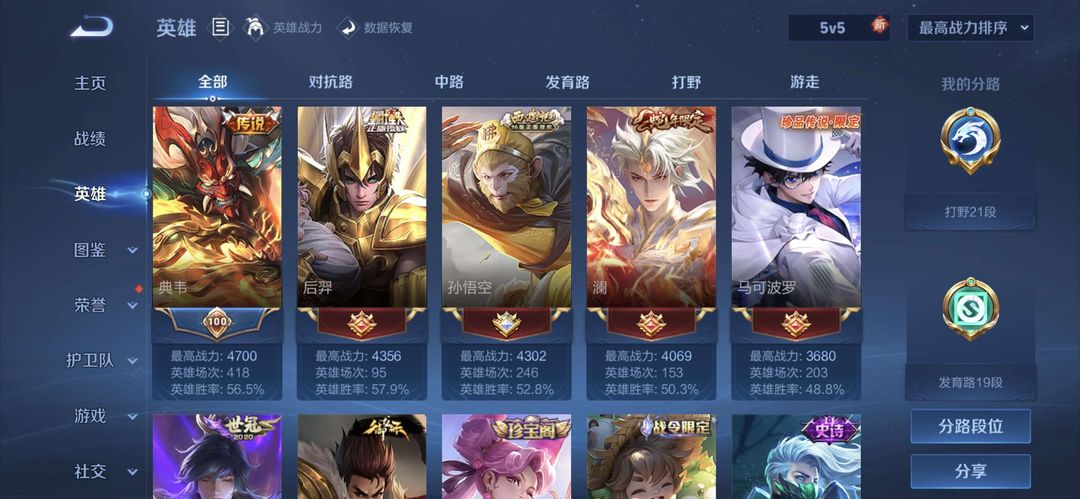 全打野高级皮+全射手高级皮+段位星耀+稀有称号+稀有皮肤