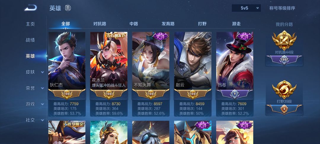 对抗路44段 数字标小国标夏洛特1.5w 金标马可波罗1.1w 金标韩信1.1w 金标花木兰 金标不知火舞 金标赵云 限定皮: 冰锋战神,李小龙,游园惊梦,梁祝,高山流水,猪悟能