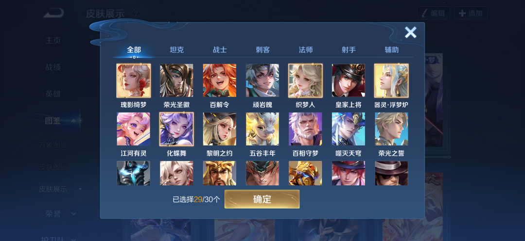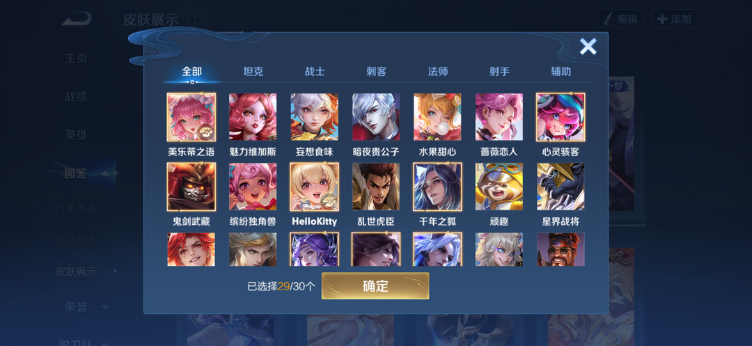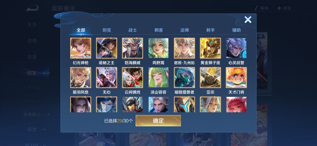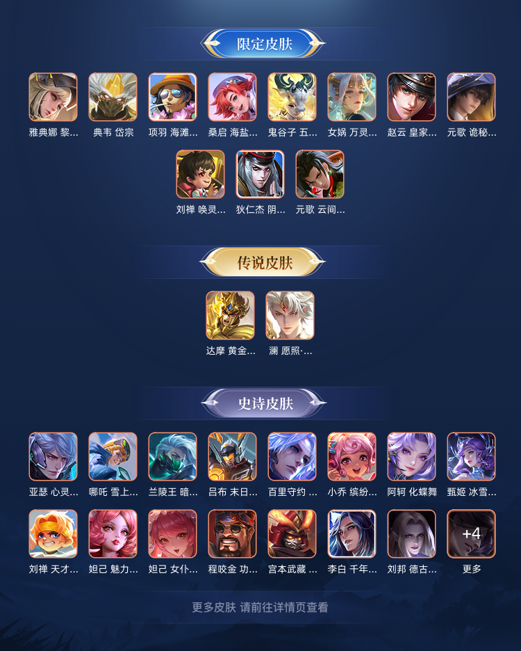 英雄:元歌(元歌 云间偶戏,元歌 诡秘之主,元歌 午夜歌剧院,元歌 无心,市标);吕布(吕布 野性能量 ,吕布怒海麟威,吕布 末日机甲,区标);典韦(典韦 铁骨偃魂,典韦 岱宗,典韦 黄金武士,区标);孙尚香(孙尚香 蔷薇恋人,孙尚香 水果甜心);杨戬(杨戬 埃及法老);达摩(达摩 黄金狮子座,达摩 拳王);蚩奼;哪吒(哪吒 罗小黑战记,哪吒 次元突破,哪吒 雪上飞焰);伽罗(伽罗 箭羽风息);澜(澜 愿照·九州拓,澜 孤猎);韩信(韩信 街头霸王);孙悟空(孙悟空 西部大镖客);赵怀真(赵怀真 器灵·浮梦炉,赵怀真 太极少年);大司命;狂铁(狂铁 命运角斗场,狂铁 龙之律动,狂铁 特工战影);影;孙权;苍(苍 苍林狼骑);铠;芈月(芈月 瑰影绮梦);司马懿(司马懿 魇语军师);公孙离(公孙离 涂山容容);关羽(关羽 龙腾万里);夏侯惇;李白(李白 敏锐之力,李白 千年之狐);蒙犽(蒙犽 顽岩魄,蒙犽 百解令);兰陵王(兰陵王 暗隐猎兽者);鲁班七号;诸葛亮(诸葛亮 掌控之力);赵云(赵云 皇家上将,赵云 忍·炎影);宫本武藏(宫本武藏 未来纪元,宫本武藏 鬼剑武藏);亚连(亚连 破局