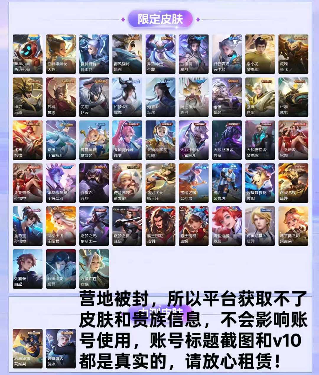 王者营地被封了,所以租号平台获取不了账号皮肤信息,并不影响游戏,账号标题和截图都是真的,请租客放心租号! 账号实际充值消费已过五千元,租客恶意开挂毁号,必追究责任,赔偿账号同等价值金额,租客每次登录会记录登录IP地址 ,请勿以身试法!