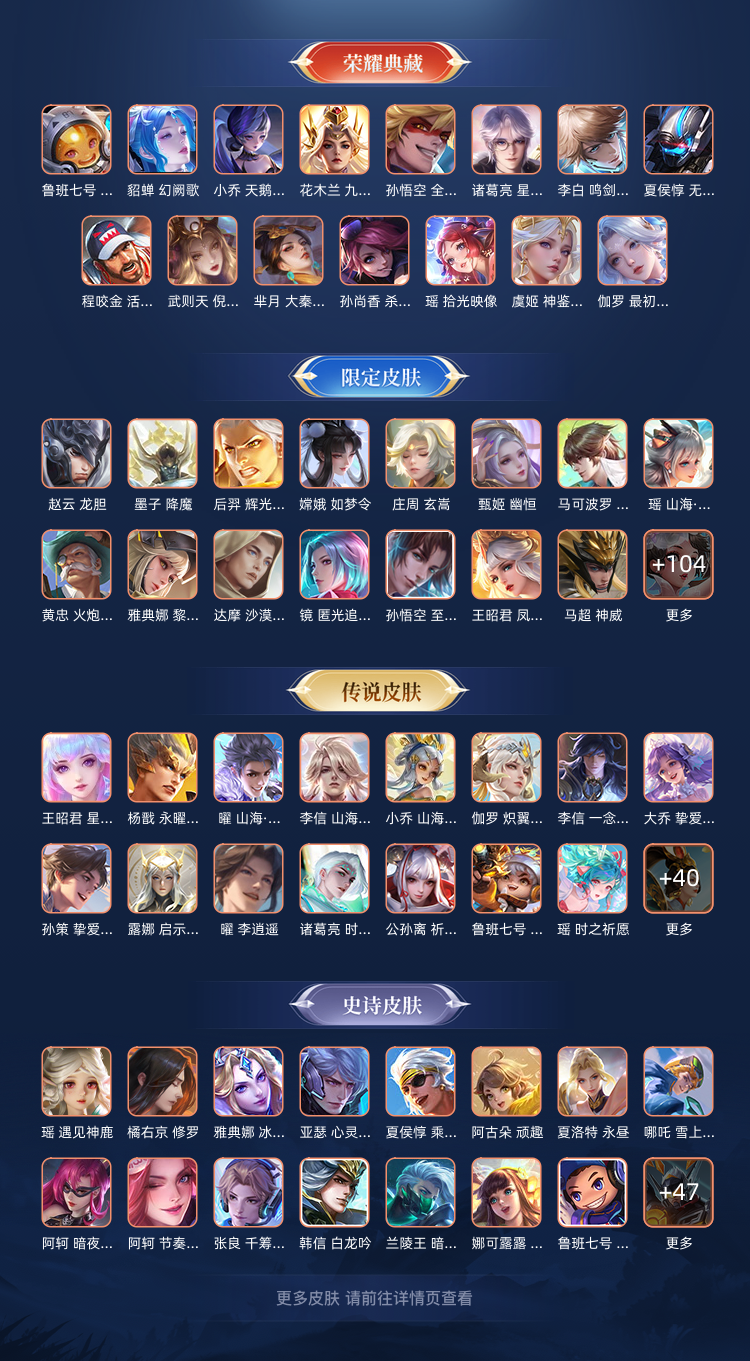 请勿挂机打广 珍品无双1 珍品传说9 无双9 典藏15 星元3 传说111 史诗249 限定345 荣耀水晶16 英雄128 皮肤702 稀有英雄11 贵族无双级 总场次28570 皮肤价值:865902 【珍品无双1】 貂蝉馥梦繁花 【珍品传说9】 暃朽木白哉 宫本武藏黑崎一护 安琪拉酷洛米之心 瑶大耳狗之梦 张飞兔狲蓬尾 嫦娥器灵落星盏 孙策时之奇旅 马可波罗怪盗基德 鲁班七号江户川柯南 【无双皮肤9】 曜器灵螭龙剑 瑶真我赫兹 甄姬雪境奇遇 不知火舞花合斗 韩信群星魔术团 小乔时之魔女 李白碎月剑心 妲己青丘九尾 武则天神器明辉仪 【荣耀典藏15】 伽罗最初的交响 瑶拾光映像 虞姬神鉴启示录 貂蝉幻阙歌 花木兰九霄神辉 诸葛亮星域神启 孙悟空全息碎影 程咬金活力突击 李白鸣剑曳影 鲁班七号星空梦想 武则天倪克斯神谕 夏侯惇无限飓风号 孙尚香杀手不太冷 芈月大秦宣太后 小乔天鹅之梦 【星元皮肤3】 王昭君乞巧织春 孙悟空零号雷霆 虞姬无限倾慕 【传说皮肤111】 杨戬纵目迁山 后羿黄金射手座 后羿神树通天 干将莫邪千山共赴 大司命死亡执政官 司马懿九山相柳 西施续相思 杨玉环星之