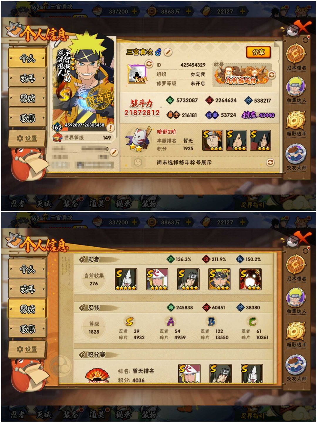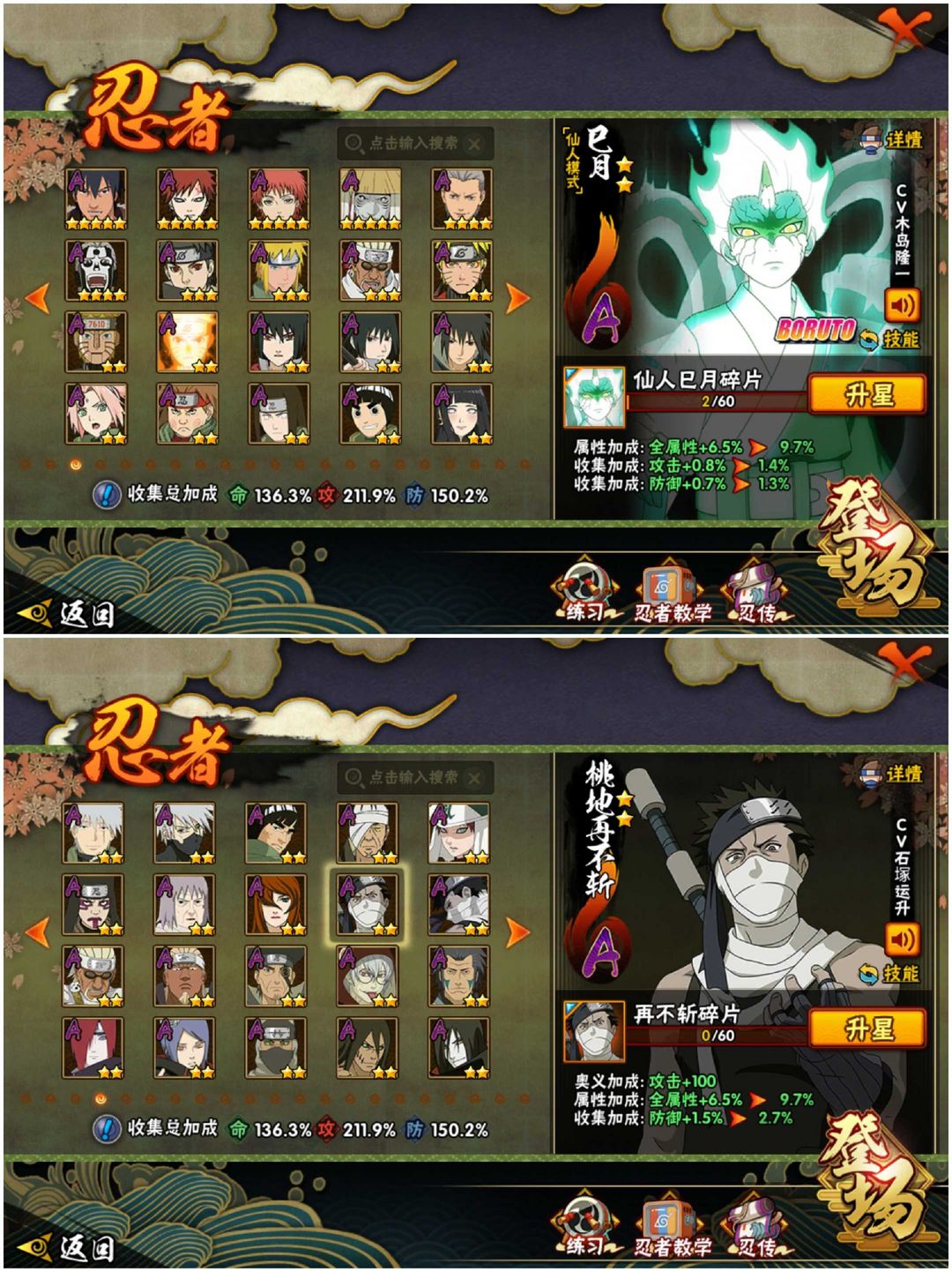 S忍者:【漩涡鸣人 「九喇嘛连结」,宇智波佐助 「永恒万花筒」,宇智波带土 「忍界大战」,千手柱间 「秽土转生」,大筒木桃式,宇智波鼬 「秽土转生」,自来也 「舞之豪杰」,药师兜 「仙人模式」,宇智波斑 「秽土转生」,“宇智波斑” 「白面具」,千手扉间 「秽土转生」,纲手 「百豪」,宇智波斑 「五影会谈」,漩涡鸣人 「暴怒·第六尾」,宇智波止水 「须佐能乎」,艾 「忍界大战」,自来也 「传说中的三忍」,艾 「四代目雷影」,波风水门,波风水门 「秽土转生」,大蛇丸,纲手,佩恩 「天道」,千手扉间,千手柱间,神秘面具男,宇智波斑,宇智波鼬 「须佐能乎」,猿飞日斩,猿飞日斩 「秽土转生」,长门 「秽土转生」,自来也,神秘面具男 「红夜之刃」,宇智波斑 「秽土转生·解」,春野樱 「忍界大战」,波风水门 「九喇嘛连结」,旗木卡卡西 「须佐能乎」,迈特凯 「死门」】
