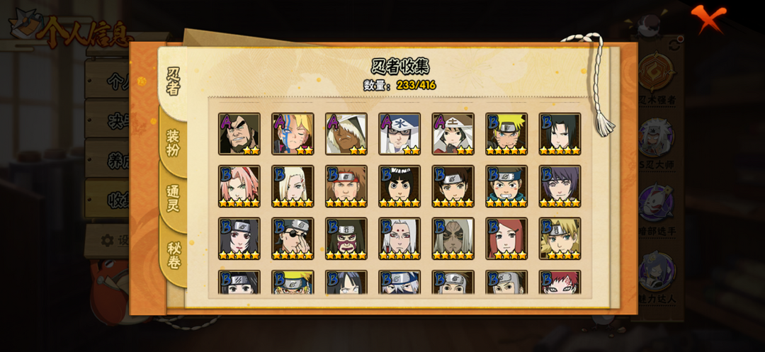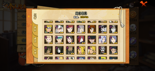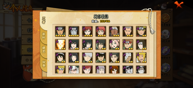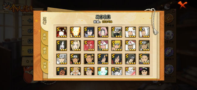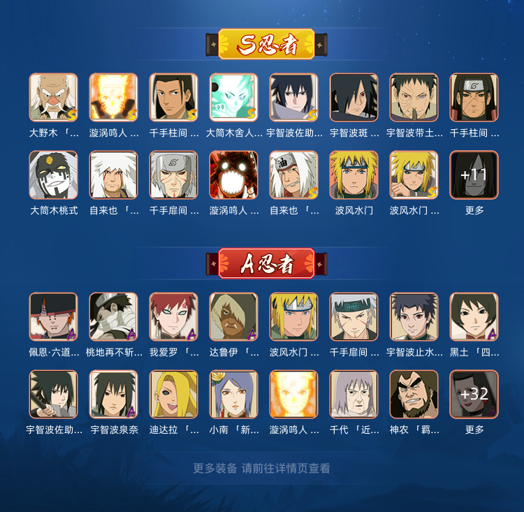 A忍者:佩恩·六道 「漂泊浪客」;桃地再不斩 「秽土转生」;我爱罗 「新春限定」;达鲁伊 「五代目雷影」;波风水门 「青年」;千手扉间 「漂泊武士」;宇智波止水 「新春限定」;黑土 「四代目土影」;宇智波佐助 「须佐能乎」;宇智波泉奈;迪达拉 「秽土转生」;小南 「新春限定」;漩涡鸣人 「九尾查克拉」;千代 「近松十人卫」;神农 「羁绊」;不缘;日向雏田 「最终章」;长十郎 「六代目水影」;蝎 「绯流琥」;角都 「秽土转生」;波风水
