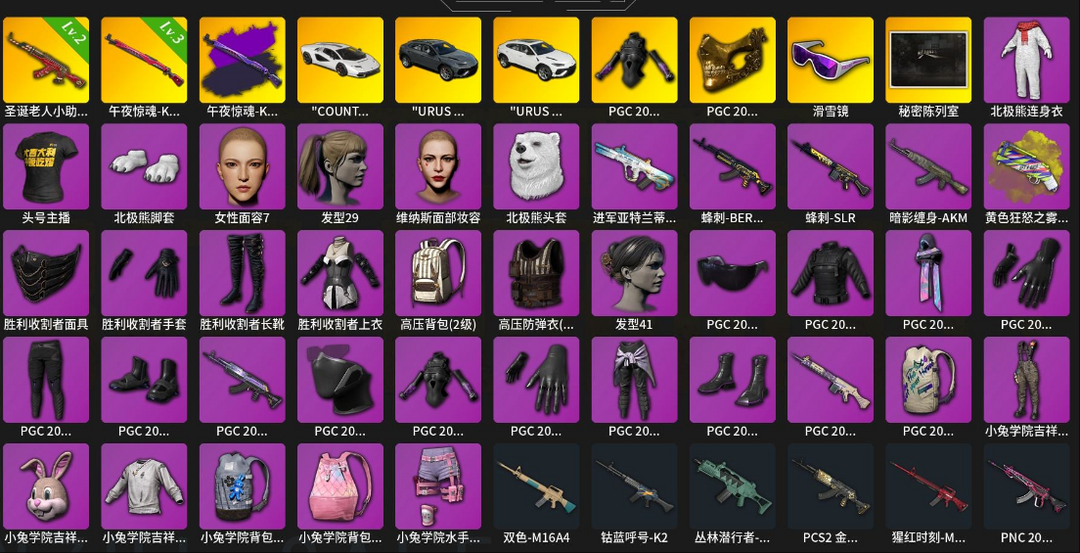 满兰博基尼有大厅/隐藏车漆黄金烙/满级圣诞AKM/滑雪镜/熊脚/烟枪/发光套/双马尾/大金牙/波浪头