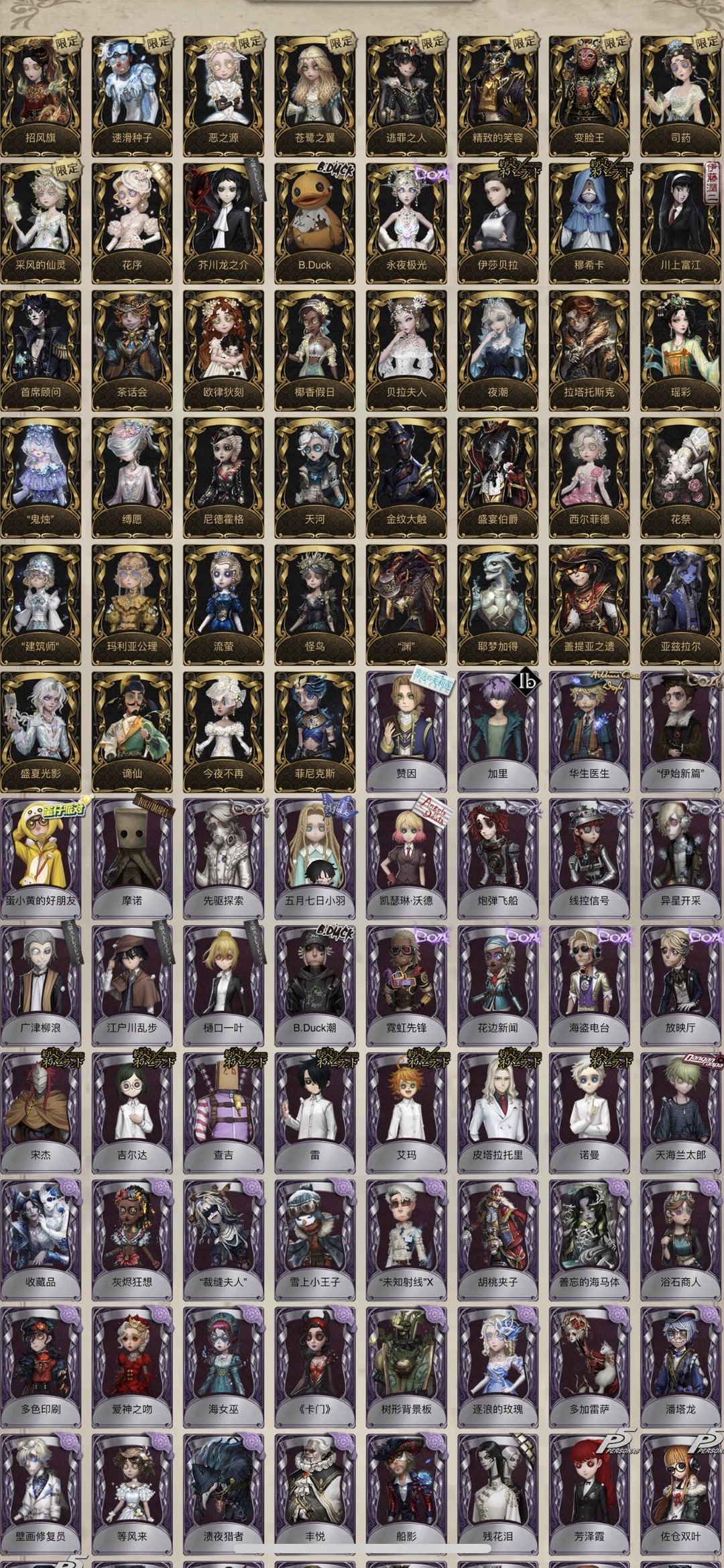 【迷雾山庄】天河 椰香假日 欧律狄刻 芥川龙之介 蚕食者 广津柳浪 樋口一叶 花序 小丑新年套万象乾坤礼包 乾坤袋 拉塔托斯克 茶话会 长生 阴阳司公 速滑种子 逃罪之人 苍鹭之翼 恶之源 邪派魅力 伊莎贝拉 穆希卡 永夜极光 B.Duck 流萤 金纹大触 盛宴伯爵 今夜不再 精致的笑容 亚兹拉尔 菲尼克斯 渊 喜多川祐介 树形背景板 等风来 卡门 浴石 残花泪 艾玛 宋杰 吉尔达 皮塔拉托里 诺曼 雷 查吉 霓虹先锋 花边新闻 海盗电台 放映厅 B.Duck潮 炽天使 感染 绿纹大触 白纹大触 月佑者 祈雨之女 波塞冬 月下绅士 历战猎人 纸皇后 宝钻女爵 线控信号 狡 女高音 王子 球球 反骨之缚 迷迭香 命运轮盘 凯瑟琳沃德 等,